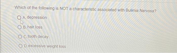 Which Of The Following Is Not A Characteristic Of Bulimia Nervosa A Binge Eating B Tooth Decay Sore Throat And Hair Loss C Use Of Vomiting Laxatives Or Diuretics To Lose Weight